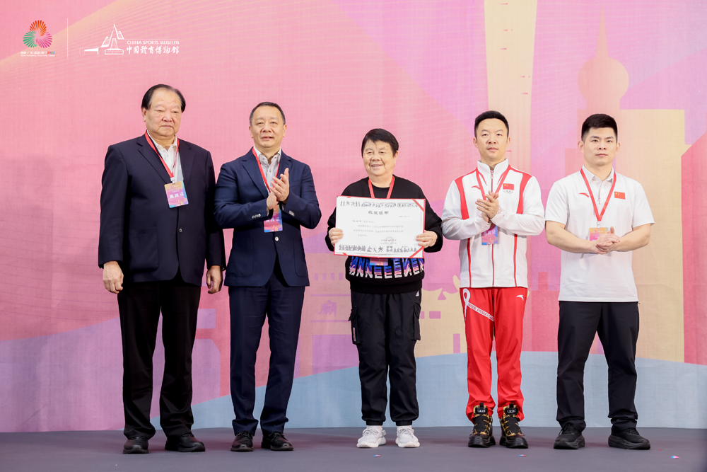 开展仪式上,参加过第1届至第3届全运会的老运动员代表邓蓉蓉在奥运冠军许海峰、郭伟阳和林清峰的见证下,向中国体育博物馆捐赠了第1届至第3届全运会历史见证物。这些珍贵的藏品,是新中国体育砥砺奋进的鲜活印记,彰显了老一辈体育人对体育事业的赤诚坚守、中华体育精神的薪火相传。国家级高级工艺美术师高俊将创作的紫砂作品《窗前的体育茶话》《盛世丰韵》捐赠给中国体育博物馆。国家体育总局体育文化发展中心党委书记、主任,中国体育博物馆馆长黄金代表中国体育博物馆接受捐赠,并为捐赠者颁发收藏证书。