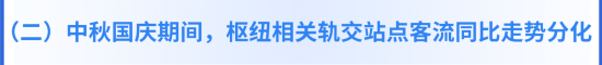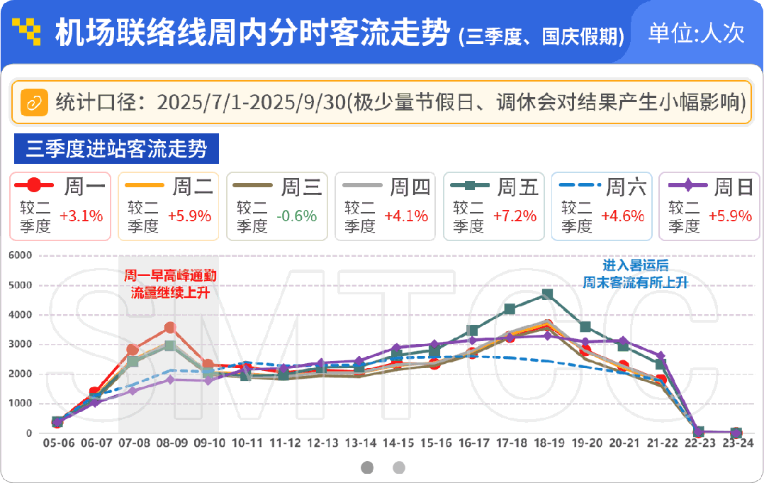 部分平峰时段与高峰时段的客流差距已缩小。通过与二季度客流数据相比,周一早间时段(8:00-9:00)通勤客流叠加枢纽出行,小时客流上升17.5%,远高于其他时段。各平峰时段走势分化,但增幅和降幅都有限,客流趋于稳定。中秋国庆返程高峰,10月7日至8日,全天进站客流量均要显著高于假期前几日,详见下图:
