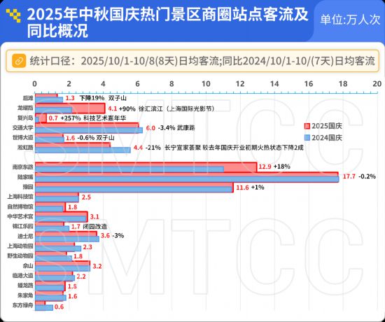 市区各主要景区商圈方面,最值得关注的是“上海国际光影节”对于徐汇滨江区域的客流拉动作用,龙耀路站日均客流达4.1万人次,同比增长9成。而去年的热门地标区域如双子山、宜家荟聚、武康路等今年则客流平稳。