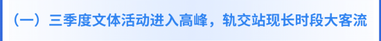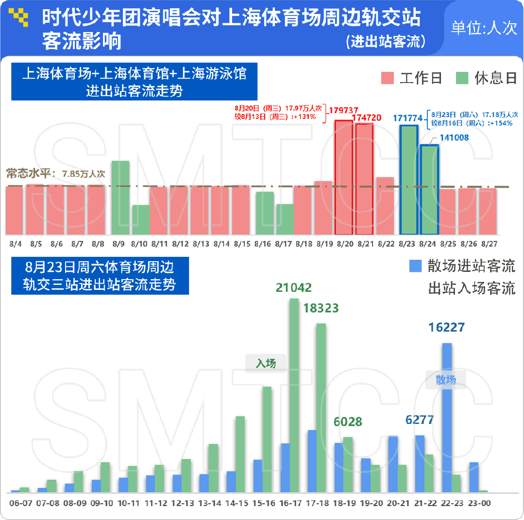 三季度体育赛事、场馆演出、大型会展等活动进入高峰,周边轨交站点客流持续增加。大型演唱会方面,因时代少年团“加冠礼”演唱会,自8月17日至24日上海体育场周边部分区域、道路实施了临时交通管控措施。期间,上海体育场、上海体育馆、上海游泳馆三站合计单日进出站客流最高近18万人次(8/20周三,叠加通勤客流),较常态(下图棕色均线%。详见下图:
