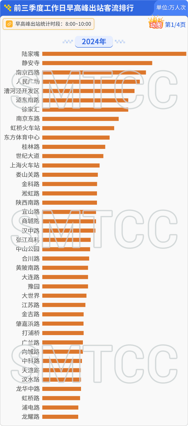 早高峰岗位相对密集区域出站客流方面,陆家嘴、静安寺、南京西路、人民广场、漕河泾开发区等站工作日早高峰出站客流排行前五,西岑(青浦华为)、龙耀路(徐汇滨江)、康恒路(运营近一年)等站客流增量排名居前。