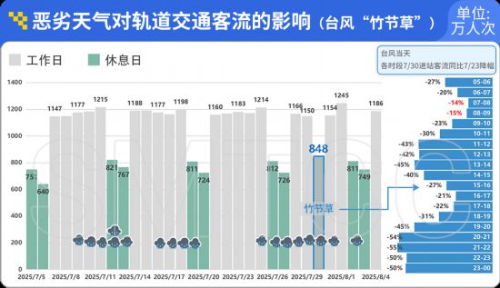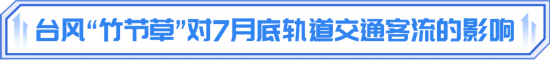 受台风“竹节草”影响,7月底轨道交通客流出现显著低谷,当日平峰时段进站客流大幅下降,但通勤客流影响较小。“竹节草”7月30日影响上海,下午登陆时已减弱为热带风暴级。当天全网轨交客流仅848万人次,同比前一周三下降28.3%,其中平峰时段进站客流普遍下降2成及以上,11时至15时下降约4成,但早高峰7:00-9:00降幅仅14%左右,因此本次台风对通勤客流的影响相对有限。