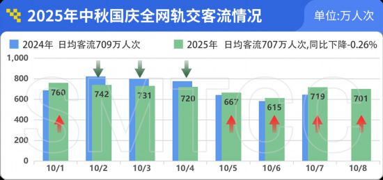 中秋国庆期间全网轨交日均客流707万人次,同比下降0.26%。对比2024年国庆7天,10月2日至4日轨交客流未超去年同期,8天日均客流同比有0.26%的微幅差距。假期最高客流日出现在10月1日,全天客流760万人次,而10月6日为相对低谷,全天客流仅615万人次。