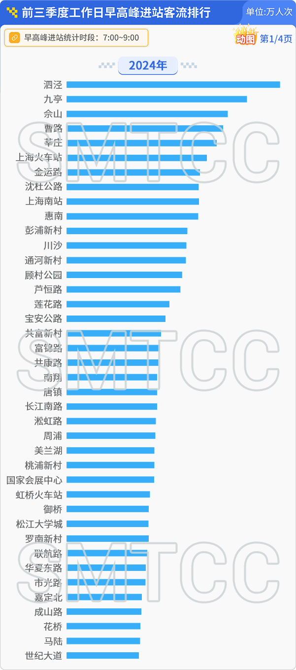 2025年前三季度工作日早高峰客流同比2024年,居住相对密集区域进站客流最大的五个站点仍是泗泾、九亭、佘山、莘庄、曹路;另外,淀山湖大道、上海松江站、漕盈路、景西路等进站客流增量排名居前。
