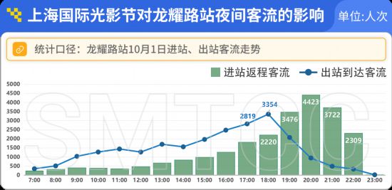 龙耀路站9月19日(周五)当日晚(19:00-0:00)进出站客流即升至2.12万人次,较一般工作日上升61.8%;9月20日(周六)晚间客流达到1.67万人次,较常态休息日上升117%;国庆假期因光影节热度的持续,客流维持高位,10月1日晚间进出站客流达1.78万人次。观察当晚进出站分时客流走势,出站到达客流的高峰在17时-19时期间,而19:00后进站返程客流开始递增,并于20时-21时达到高峰,小时进站客流4423人次,详见下图: