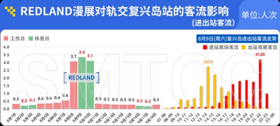 进入暑假,本市多个大型动漫会展、书展,吸引大量本市及外省来沪游客前往。BilibiliWorld举办时间为7月11日至7月13日,轨交国家会展中心站日均进出站客流达14.5万人次,较去年展期(2024/7/12-7/14)大幅上升18.9%,7月11日达峰值客流16.1万人次,高于今年车展期间13.7万人次的峰值。ChinaJoy举办时间为8月1日至8月4日,而其所在的新国际博览中心周边的花木路站,日均客流飙升至6.2万人次,同比去年会展期间(2024/7/26-7/29)微幅上升0.6%。此外,复兴岛首次举办REDLAND漫展,原本相对冷清的轨交复兴岛站客流显著上升,漫展3天该站进出站客流均突破了3万人次,约为休息日水平的10倍,不过由于该站客流基数较低,整体运行平稳,详见下图: