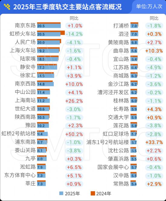 本季度进出站客流同比上涨的站点占24%(含5个新增站)。客流排行前五的站点分别为南京东路、虹桥火车站、人民广场、上海火车站、陆家嘴。除重要交通枢纽外,客流同比显著上升的站点包括南京西路(二季度新增“路易号”地标)、淞虹路(去年三季度末新增宜家荟聚)、东方体育中心(前滩)、曲阜路(大悦城)等。