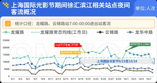 顶级光影艺术与网红效应的叠加,重塑轨交客流特征——工作日出现休闲客流高峰、休息日出现“晚高峰”。上海国际光影节9月19日开幕,徐汇西岸穹顶艺术中心为主会场。从周边的轨交站点夜间客流变化来看,龙耀路站客流波动最大,而云锦路、龙华中路影响较小。