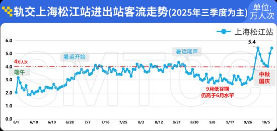 轨交上海松江站三季度走势依旧稳步向上,10月1日创下5.4万人次客流纪录(刷新5月1日4.7万人次的客流纪录)。从下图也能明显看到,相较于虹桥、南站等通勤大站,暑运对于客源单一的上海松江站,客流提振效果更为显著。