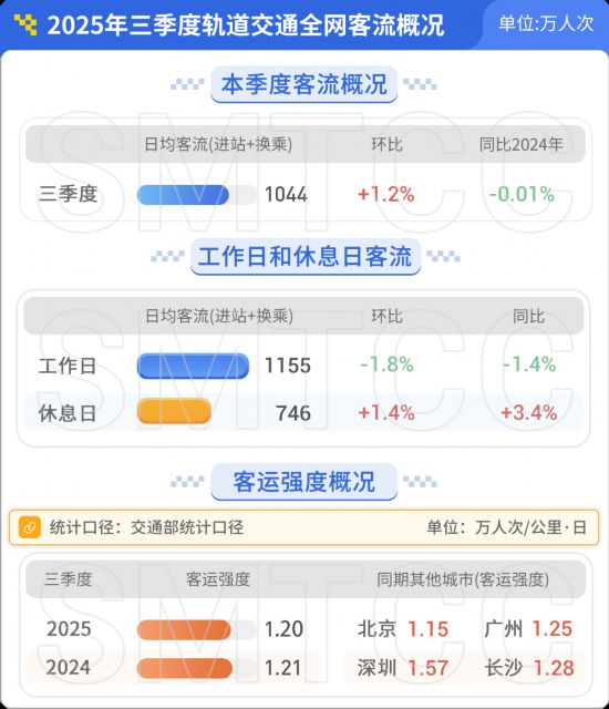 2025年三季度日均客流1044万人次,环比上升1.2%,同比微降0.01%。其中,休息日日均客流746万人次,环比上升1.4%,同比上升3.4%。