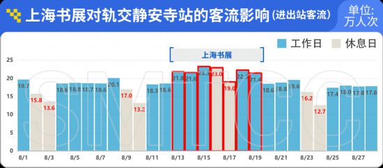 上海书展于8月13日至19日在上海展览中心举办,期间静安寺站日均进出站21.8万人次(同比2024书展8/14-8/20,上升2.7%),较常态客流上涨26.6%(工作日对应上涨15.9%,休息日对应上涨48.3%),周六8月16日静安寺站全天进出站客流23万人次,全网排名第4,对于静安寺这样的大基数站点,存在一定的客流压力。