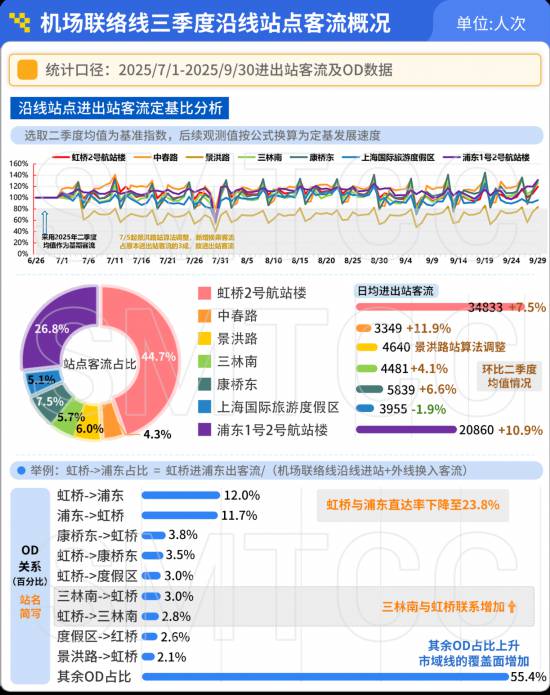 虹桥与浦东机场枢纽间直达率从二季度24.8%小幅下降至23.8%,中秋国庆假期10月4日的枢纽间直达率达到28.5%,远高于节前9月30日的19.5%及返程高峰10月8日的20.2%。线路其余站点中,中春路、康桥东进出站客流涨幅较高,分别达到11.9%、6.6%。景洪路站7月5日起算法调整,新增换乘客流,日均换乘约2790人次(10/1峰值达4413人次),该站进出站客流则相应下降约3成。