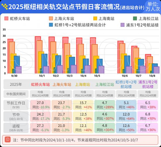 中秋国庆期间各枢纽相关轨交站点客流出现分化,虹桥火车站及上海火车站同比下降。因铁路调图,轨交上海南站、上海松江站客流同比大幅上升,上海火车站同比下降。虹桥火车站铁路到发客流同比创新高,但由于机场联络线的分流,轨交虹桥火车站客流以下降为主,但返程阶段同比降幅收窄至6.1%;受机场联络线引流及民航到发客流增长影响,虹桥2号航站楼轨交客流同比显著增长超5成。浦东机场轨交客流同比显著增长超3成。