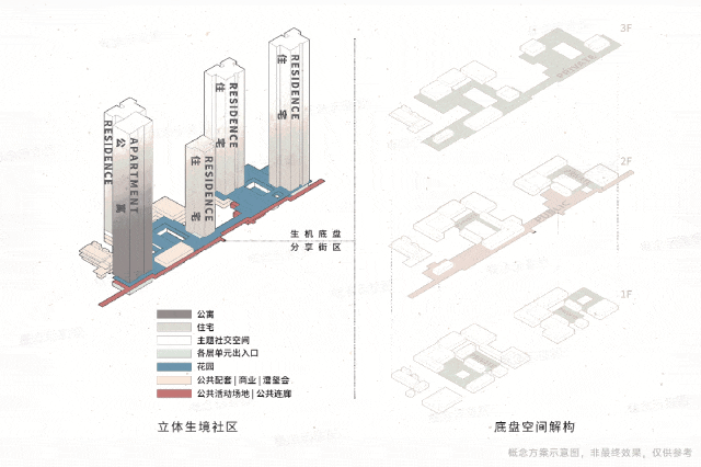 创新打造「生机底盘」,构筑都市绿洲,回归内心宁静。首层庭院围合出静谧绿洲,阔绰车马院与酒店式落客区以从容礼序迎接归家;二层环廊将通过约2公里慢行长廊(规划中)衔接城市艺术与商业;三层天际花园融汇浮岛、水景与萌宠乐园,营造出全龄共聚的度假式社交场域。