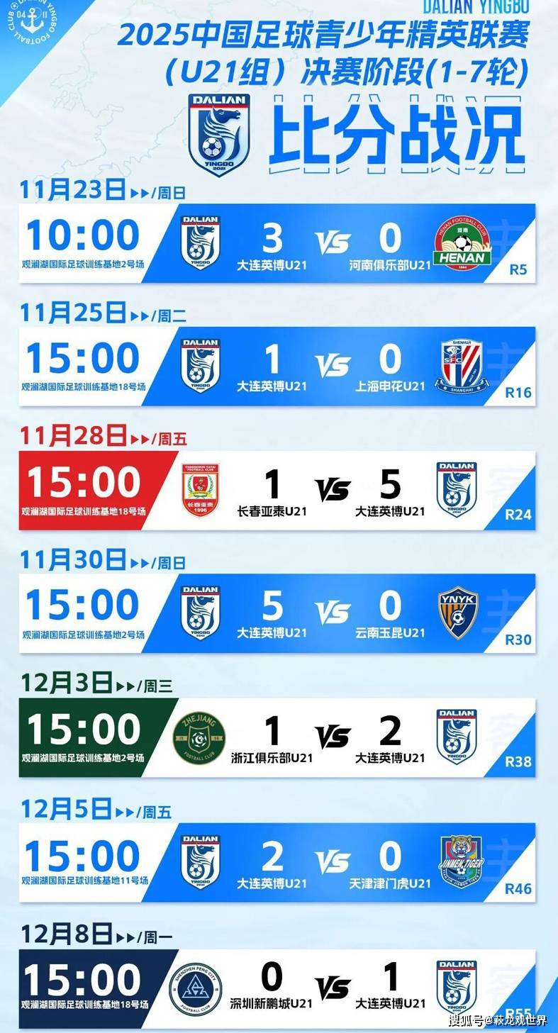 这支大连英博U21在U21联赛可谓所向披靡,球队在争冠组七战全胜,其中第6轮2-0击败天津津门虎之后,提前一轮夺冠。12月8日,观澜湖国际足球训练基地18号场,英博U21与深圳新鹏城U21进行小组赛最后一场比赛,凭借上半场靖宽杰的闪击进球,1-0战胜对手,取得决赛阶段七连胜!
