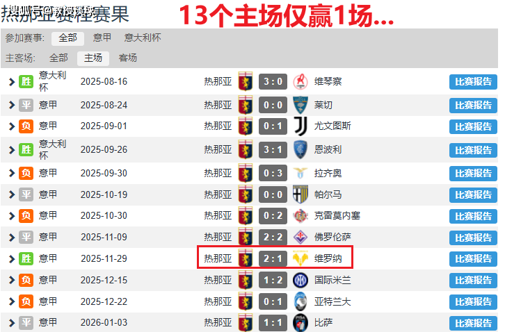 但在本赛季的热那亚,这种定律失效了。赛前的一组冷冰冰的数据足以让所有支持主队的人倒吸一口凉气: