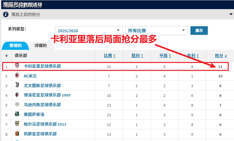 这并非偶然,数据显示,卡利亚里本赛季在落后局面下已经抢回了11分,高居意甲榜首。