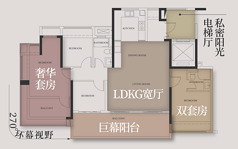 位于西边户的户型,三面景观,西面白云山景观,南向广州中轴+园林景观,北向白云山+园景;再加上约21米270°云山观景面,视觉享受拉满了。