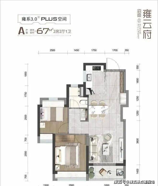 67㎡的2房2厅1卫,设计的是竖厅格局,客餐厅一体化,客厅3.2米开间,S墙设计预留冰箱位,2个卧室分别是2.9/2.5米的宽度,L型厨房,卫生间三段式分离设计,东北朝向。