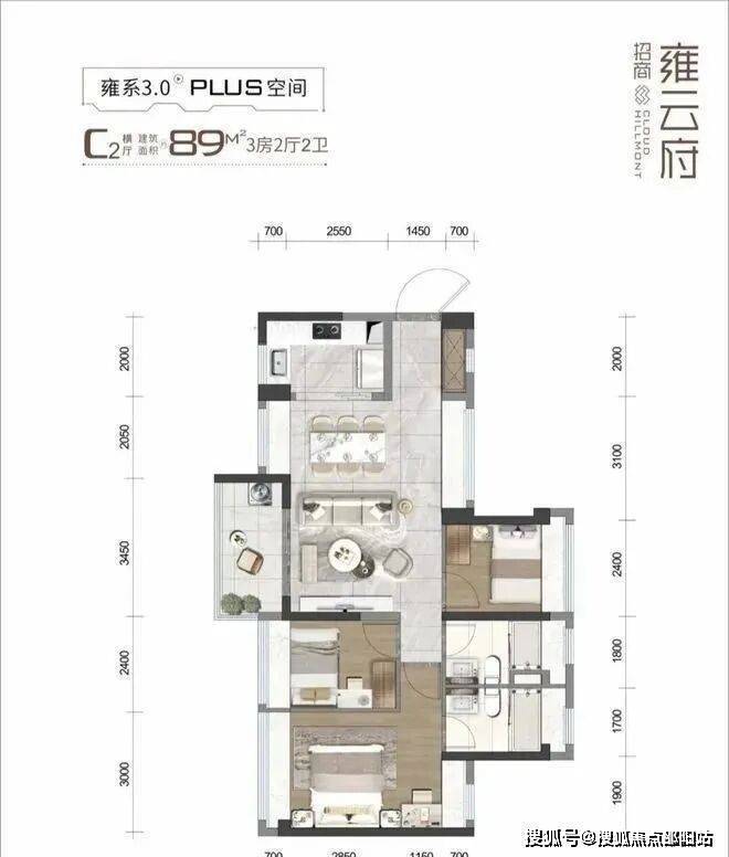 89㎡的3房2厅2卫(C2户型),设计的是横厅南北通透格局,客餐厅一体化5.5米开间,3个卧室分别是3/2.4/2.4米的宽度,L型厨房,阳台主朝西南或东南向。