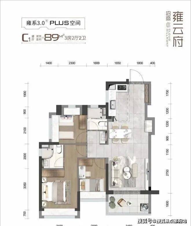 89㎡的3房2厅2卫(C1户型),设计的是经典竖厅格局,客餐厅一体化,客厅3.45米开间,S墙设计预留冰箱位,3个卧室分别是3.1/2.3/2.3米的宽度,L型厨房,公卫三段式分离设计,西南或东南朝向。