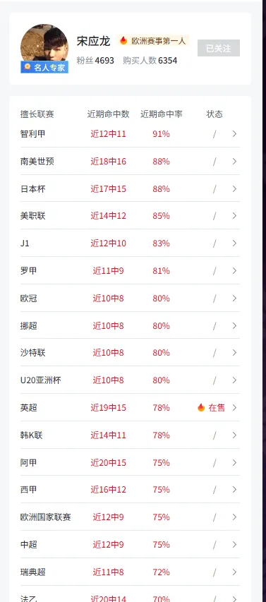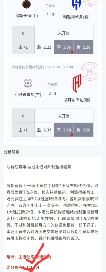hello!虎扑的兄弟姐妹们大家好,这里是宋应龙看球专栏,笔者从2014年接触体彩行业,目前从事足篮赛事推荐工作多年,擅长德甲、意甲、英超等足球各大联赛以及NBA、韩篮甲、NBL等篮球联赛。老粉丝们应该都还记得咱们去年欧洲杯期间创造的22连红的记录,相信也有很多朋友是从那个时候开始认识笔者的!2026年第一天,祝大家新年快乐!今晚精选方案已发出!感兴趣的小伙伴可以点击头像进入预测界面查阅作者最新方案!感谢大家的关注和支持~